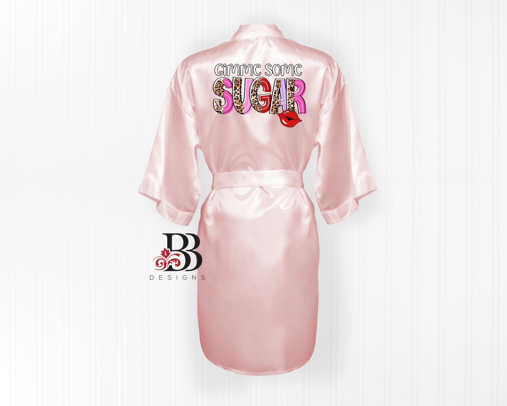 Commercial grade screen print design on soft satin, lightweight, and comfy fabric. Design placed on back of the elegant yet sexy short robe. Robe comes with 2 side pockets, belt loops and inside ties. It is colored as pictured (unless otherwise noted). No decorative accessories pictured are included, only the robe.